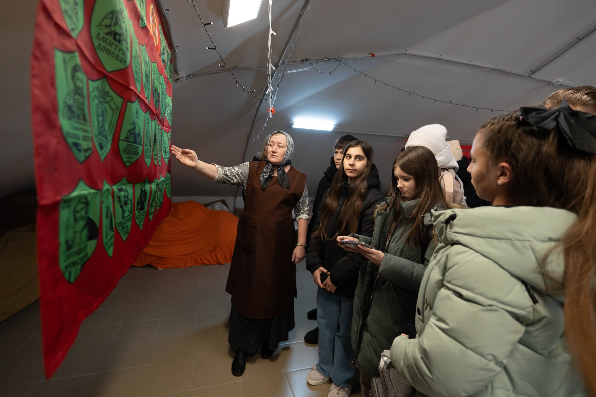 Мы провели для ребят экскурсию по фонду, сходили в храм святой Варвары, где волонтёры прямо сейчас плетут маскировочные сети для бойцов.